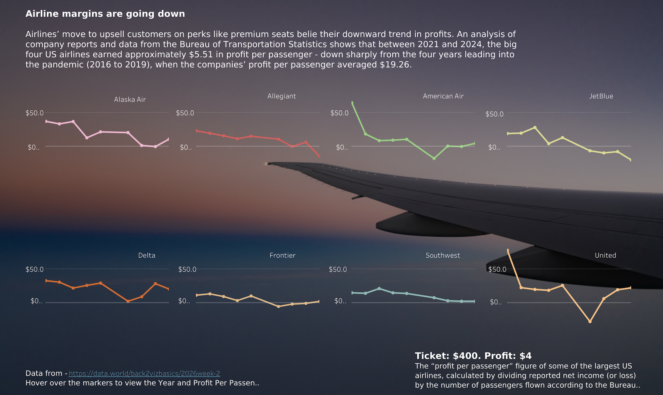 This line chart based Dashboard visualizes profit per passenger for major U.S. airlines over time,